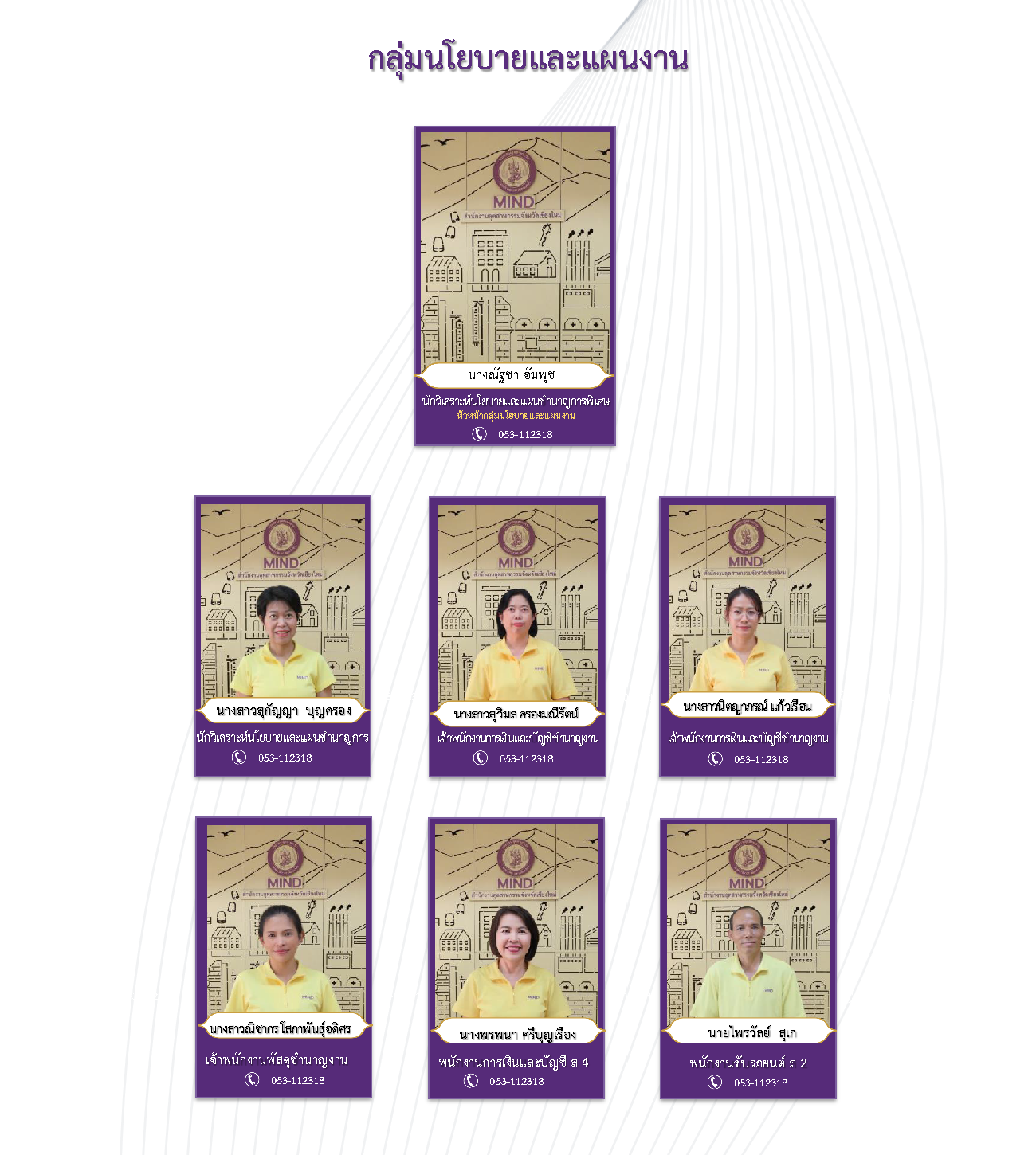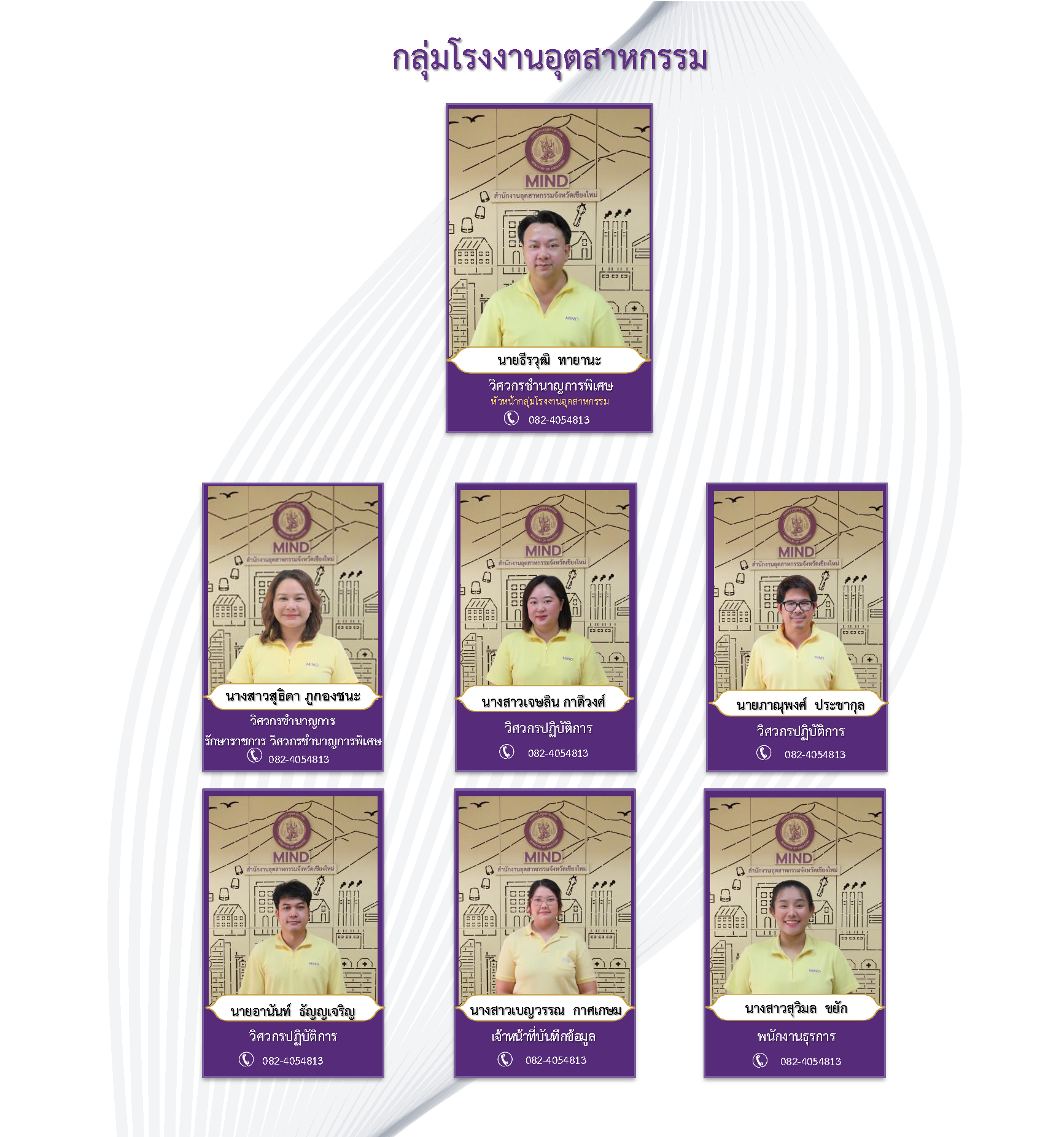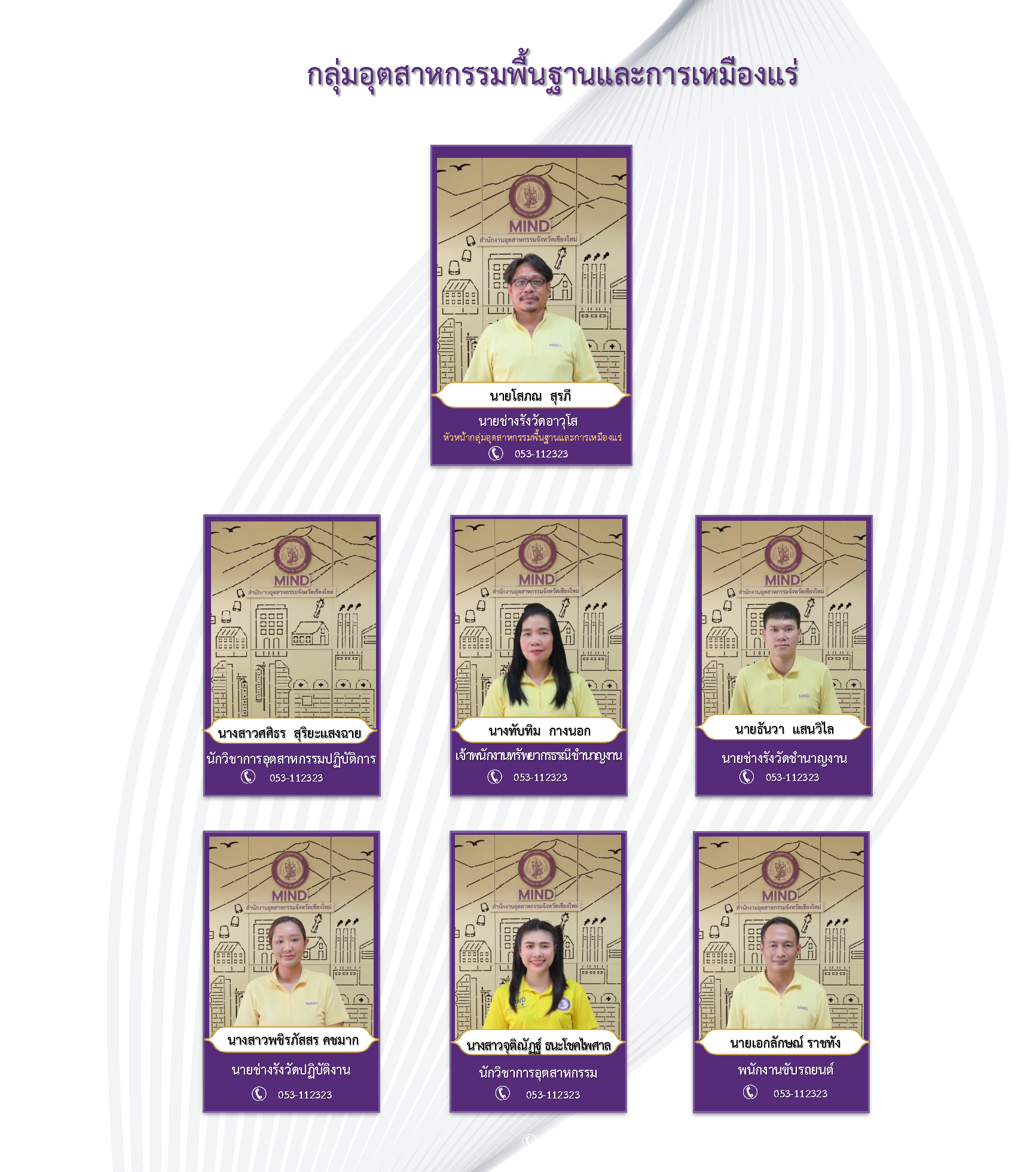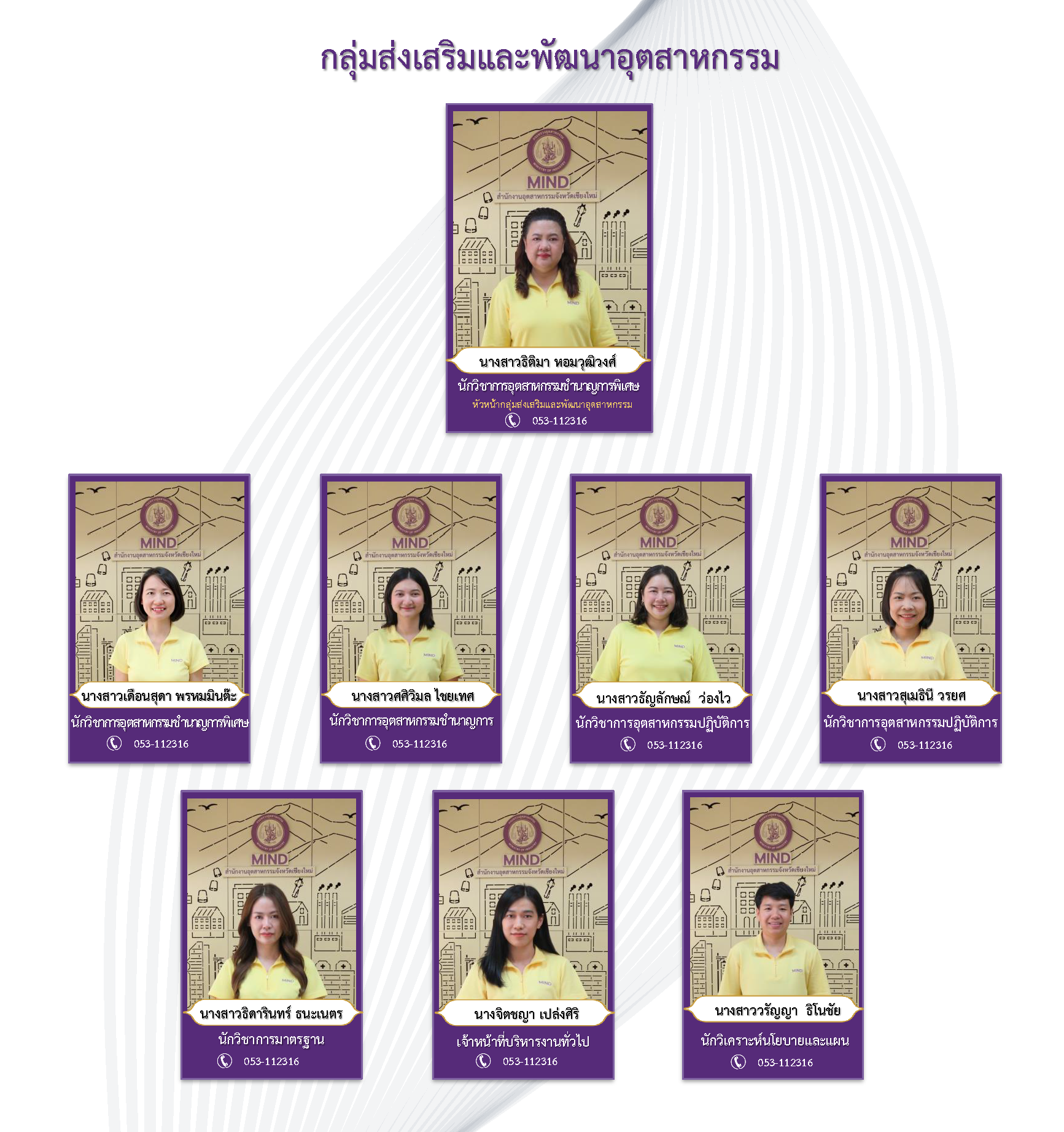 • โทรศัพท์ : กลุ่มแผน 053-112318 / กลุ่มโรงงาน 082-4054813 / กลุมเหมืองแร่ 053-112323 / กลุ่มส่งเสริม 053-112316